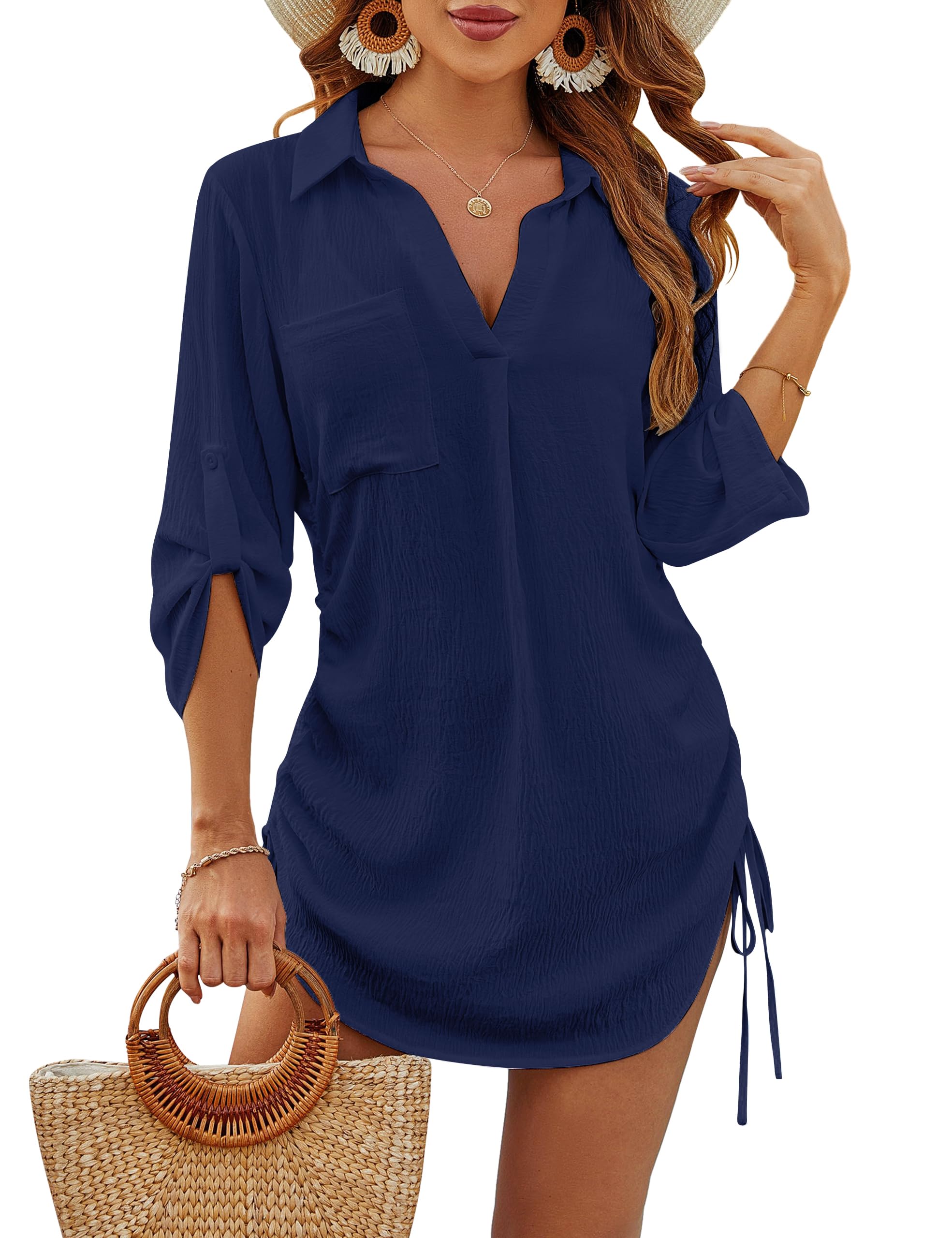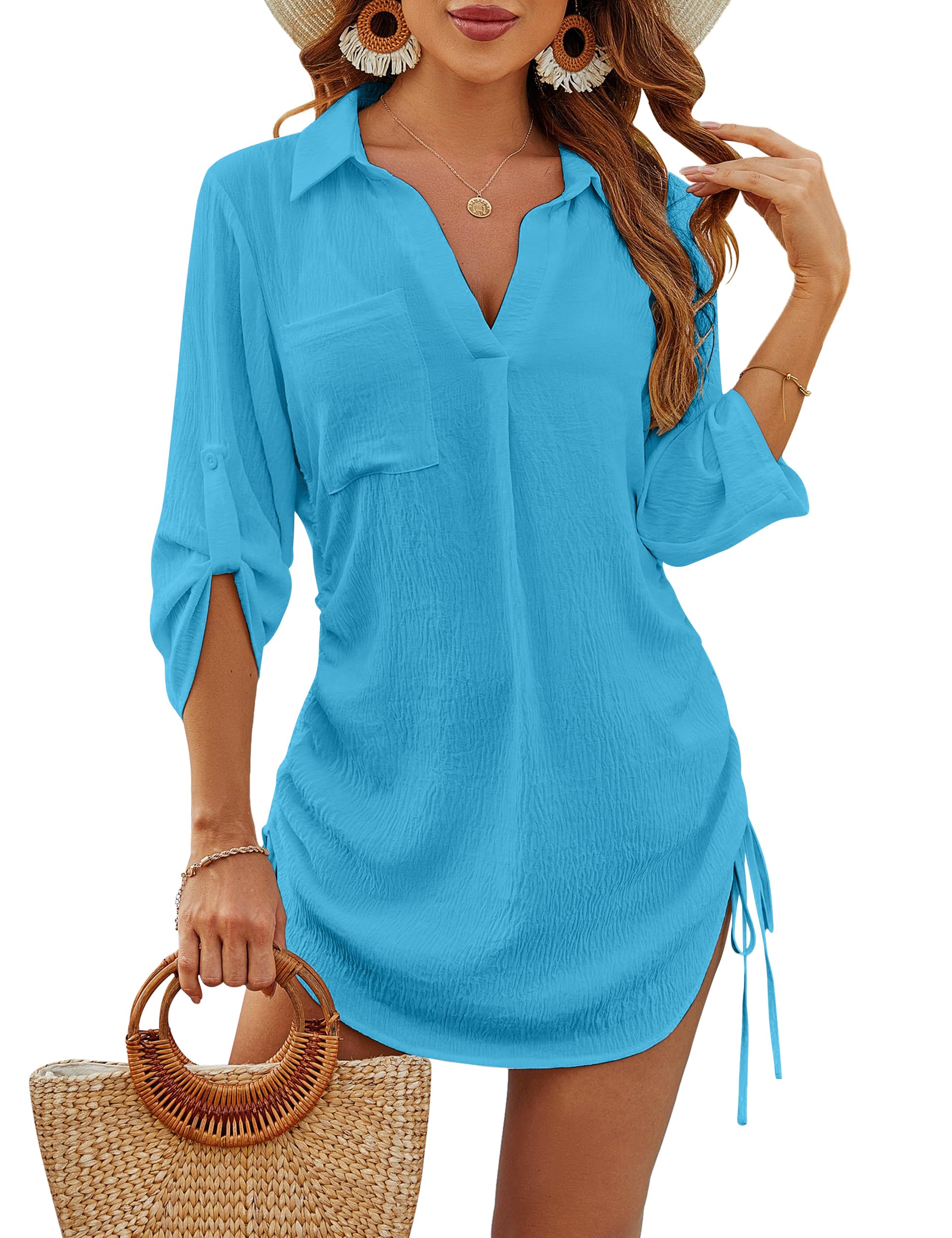 Design Features: Shirt Collar, Side Drawstring Adjustable for Fit, Lightweight, Breathable, Slightly Transparent, Loose Fit, Versatile as Cover Up or Casual Dress