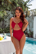 Design: Scoop Neckline, Front & Back Cutouts, Ruched Tummy Control, High-Waisted Cheeky Bottom, High Leg Cut
